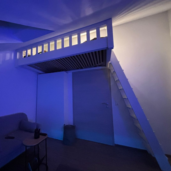 Das komplette Bett wurde hängend an die bestehende Holzständerbauweise des Gebäudes montiert - somit erhält man Stauraum darunter und keine störenden tragende Elemente.