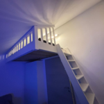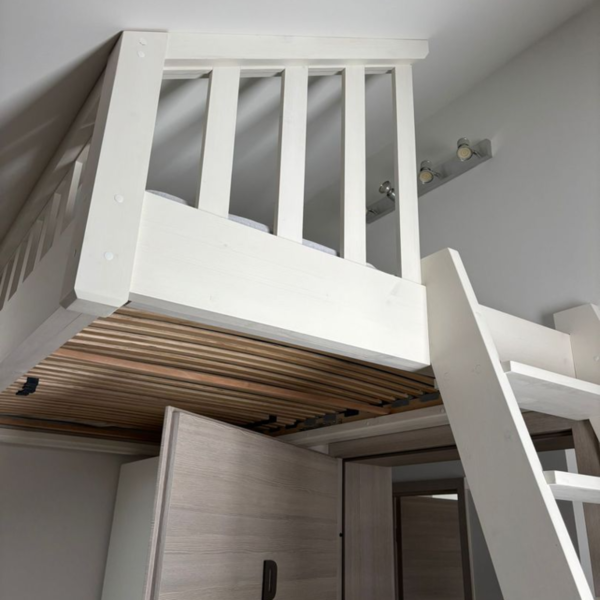 So geschehen mit diesem Hochbett aus Fichte vollmassiv. Die Holzoberfläche wurde deckend weiß gestrichen.
