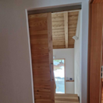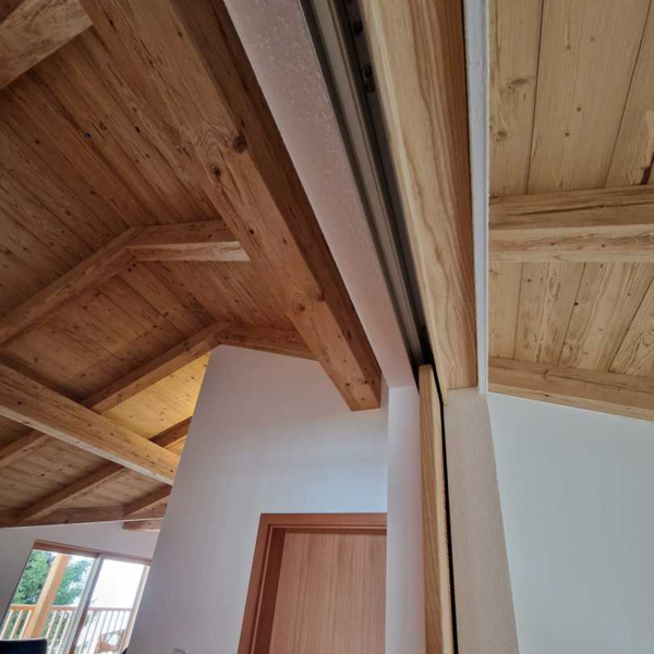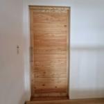 Der Hauptbestandteil des Türblattes besteht aus Lärche vollmassiv, eingefasst mit einem Esche-Rahmen - ebenfalls vollmassiv - um das Schiebetürblatt in Form zu halten.